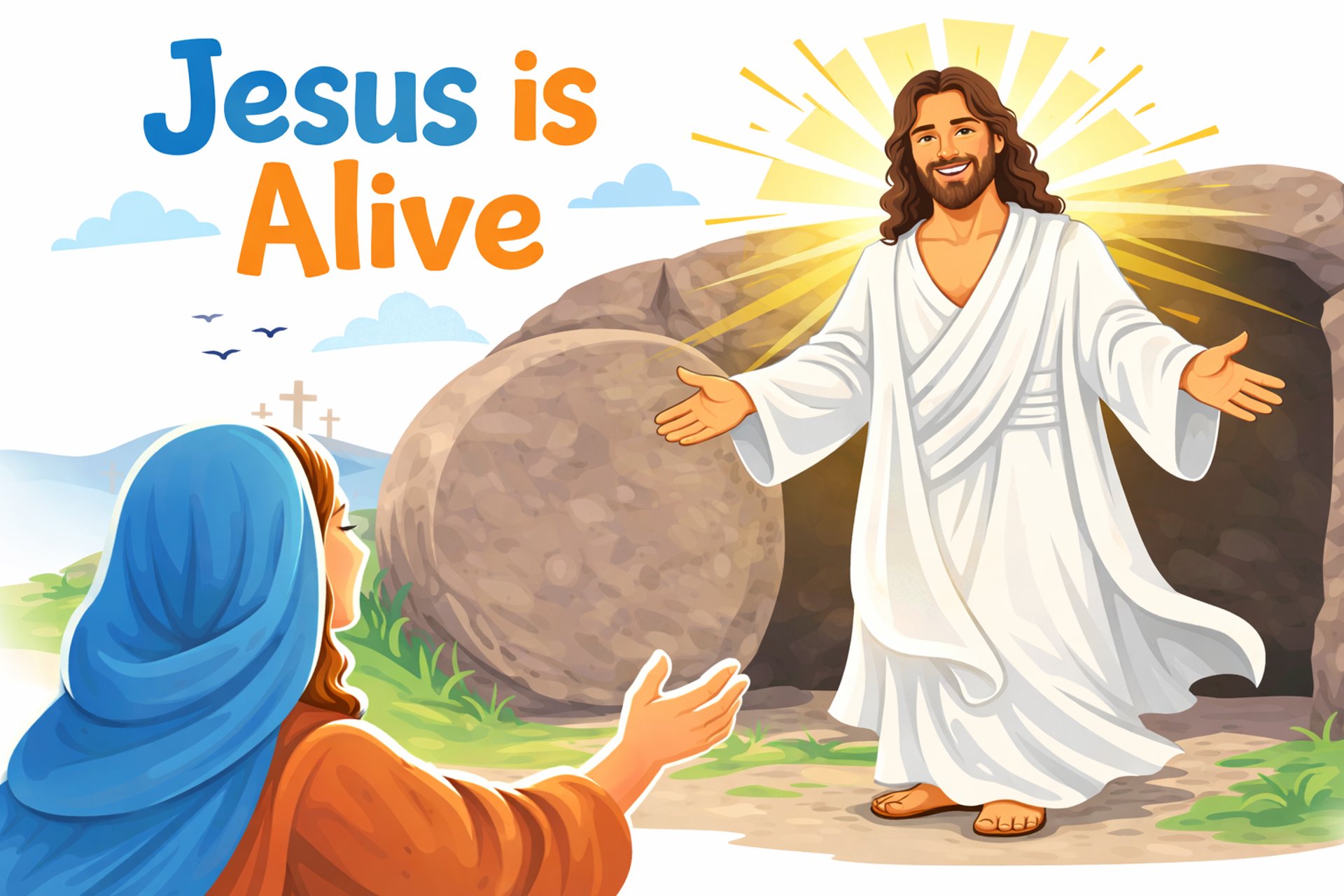 Good morning, friends! I’m so happy you are here today. Last time we learned about how Jesus gave His life on the cross because He loves us. But today we will learn the most amazing part of the story. Something incredible happened that changed everything. The grave could not hold Jesus! Today we will discover the joyful truth that Jesus is alive!