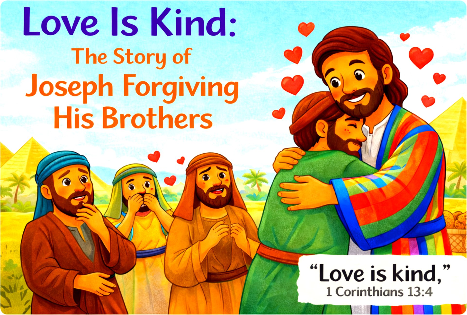 This Sunday School lesson for kids teaches children that love is kind and forgiving, based on 1 Corinthians 13:4. In this engaging Bible lesson for children, kids will discover how God’s love shows us how to treat others with kindness, patience, and forgiveness. Through a gentle, kid-friendly Bible story about Joseph forgiving his brothers, children will learn what real love looks like in action.