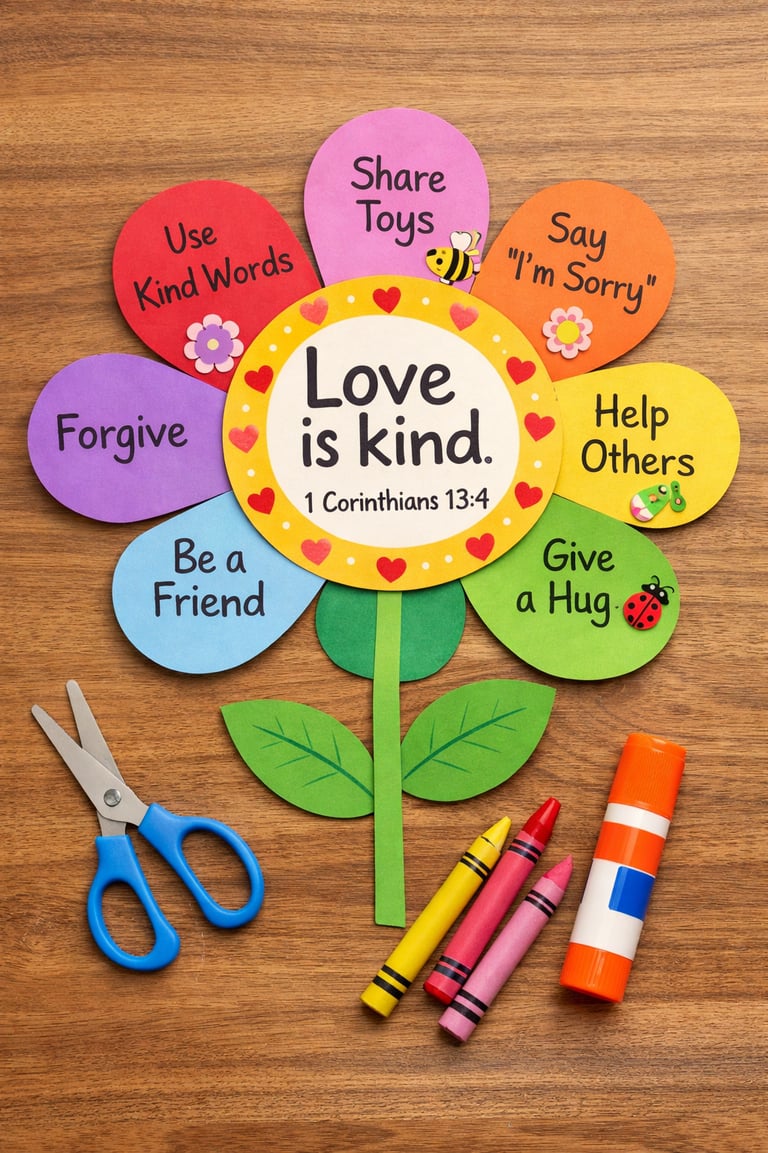 “Love is kind – 1 Corinthians 13:4”Cut out petal shapes from colored paper.
